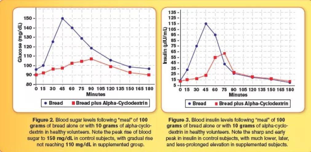 研究發(fā)現(xiàn),在飯前服用一定量的α-環(huán)糊精,能顯著降低碳水化合物膳食的血糖反應(yīng),增加胰島素。