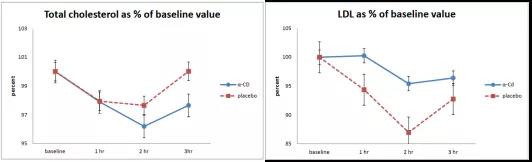 有臨床研究發現高脂飲食后10分鐘內服用2g α-CD,能明顯降低餐后人體血液中的膽固醇和甘油三酯的水平(見下表)。健康志愿者每天攝入6g α-CD,12周后發現低密度脂蛋白下降了10%,空腹血漿葡萄糖降低1.6%,胰島素抵抗指數減少11%[2]。