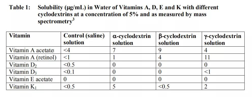 數據來源:Pitha J . Enhanced water solubility of vitamins A, D, E, and K by substituted cycloamyloses[J]. life sciences, 1981, 29(3):307-311