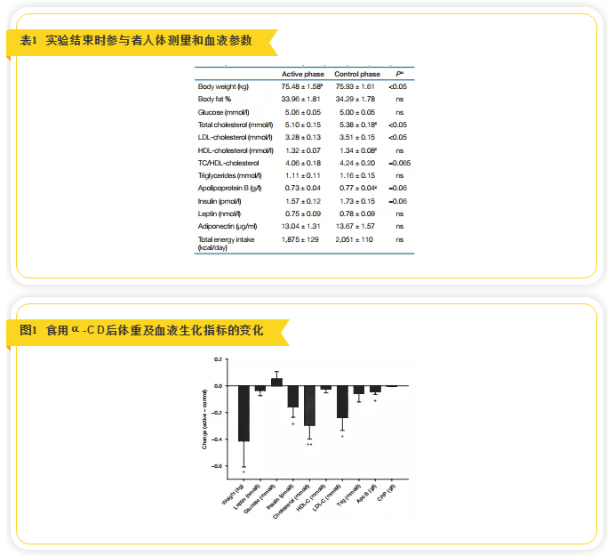 為了探討α-CD對健康人群血糖和血脂水平的影響,美國加州大學戴維斯分校醫學院內分泌科、臨床營養和血管醫學中心的研究人員進行了一項為期2個月臨床研究,研究采用隨機、對照、雙盲和自身交叉研究的方式。他們募集了41名體重超重的成年人志愿者,包括14名男性和27名女性,除超重外,身體健康,無任何其他慢性病,年齡在18~65歲之間,體重指數25 ~30kg/m2。參與者在試驗前測量各類身體參數,然后隨機分配到兩組,α-CD實驗組即active組和對照組即control組,每人每餐食用2gα-CD或普通纖維素,于進餐開始后1小時內服用完。1個月后,抽血檢測各種指標,之后交叉到相對應的實驗或對照組,再進行一個月,總實驗期限是2個月,試驗結束后再空腹測量身體各類參數。試驗過程中依從性差不服從要求的13人離開實驗,整個過程中參與者能量攝入不受限制,不改變平時的飲食和鍛煉習慣。