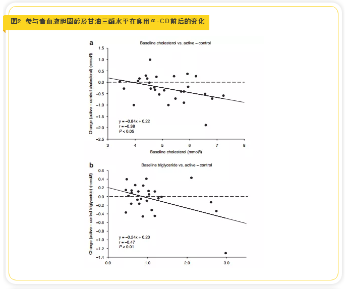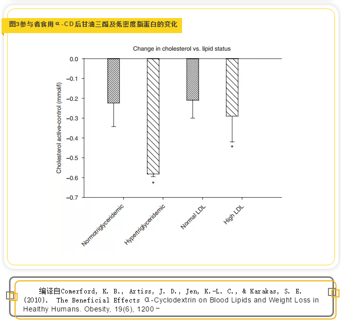 這項研究結果顯示與對照組相比,試驗組人群每天食用6gα-CD,一個月后體重平均降低0.4公斤,血清總膽固醇水平降低5.3%,低密度脂蛋白水平降低6.7%,載脂蛋白B濃度降低了5.6%。雖然兩組的空腹血糖沒有明顯變化,但胰島素水平下降了9.5%,提示胰島素敏感性增加(見表1,圖1)。研究還發現,志愿者試驗前血液膽固醇水平越高,食用α-CD期間膽固醇降低效果越好,同樣,試驗前甘油三酯水平越高的人, 補充α-CD期間降低的效果也越好(見圖2)。試驗前血液甘油三酯水平均大于2.26 mmol/L的參與者,在食用1個月的α-CD后膽固醇水平降低了11.1%。而試驗前血液甘油三酯水平均低于1.69mmol/L的參與者,α-CD干預后膽固醇水平僅降低了4.3%,無顯著性差異(見圖3)。這些發現表明,相對于血脂正常的人,高血脂患者補充α-CD后的改善效果要更明顯。